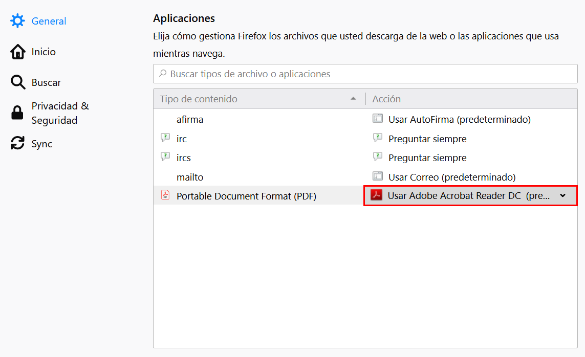 En Firefox para visualizar los documentos PDF que incorporan imágenes, como pueden ser PDF escaneados, es necesario realizar una configuración previa. Teniendo abierto el navegador Firefox, acceder a Opciones -> General -> Aplicaciones, localizar el Tipo de Contenido PDF y selecciona (Usar Adobe Reader (predeterminado). Con esto se usará Adobe Reader para la visualización de documentos PDF, en lugar del plugin de Firefox.